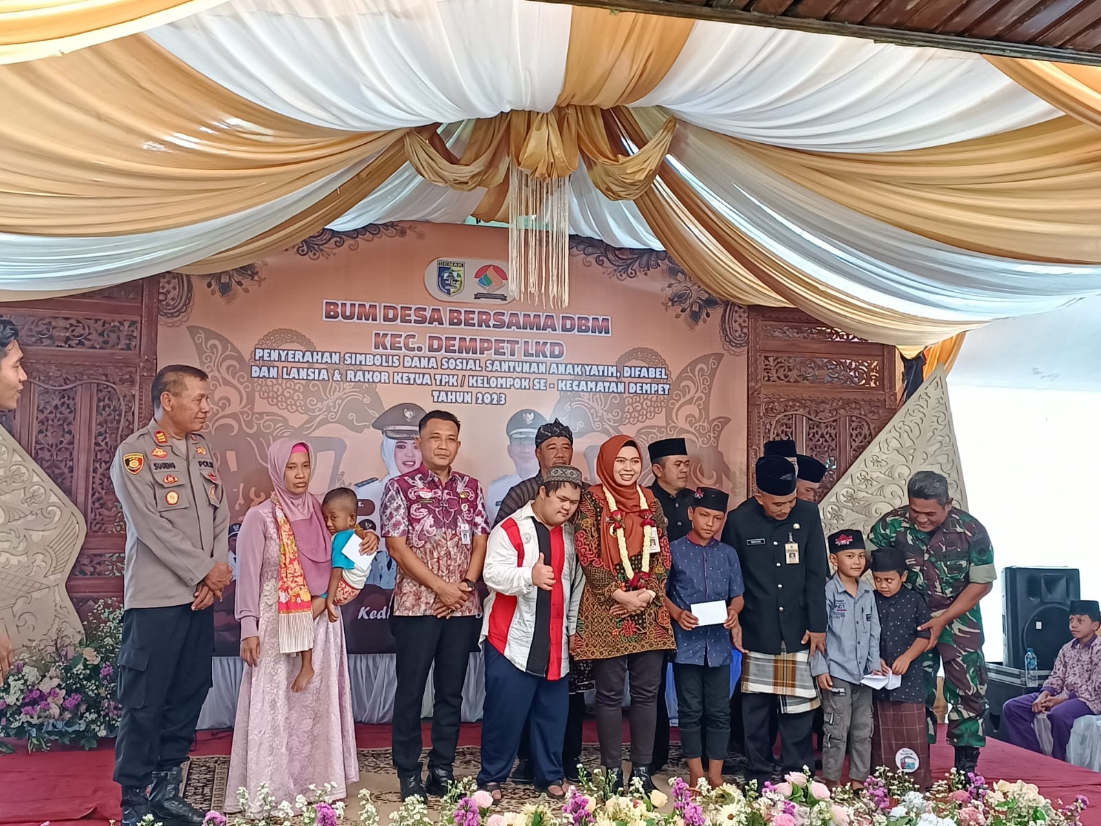 Demak – Badan Usaha Milik Desa Bersama (Bumdesma) Kecamatan Dempet menyerahkan bantuan sosial santunan anak yatim, difabel, lansia dan guru madrasah diniah (madin). Penyerahan bantuan dilakukan secara simbolis oleh Bupati Demak Eisti’anah, Kamis (23/11/23) bertempat di Pendopo Kedungori Kecamatan Dempet.