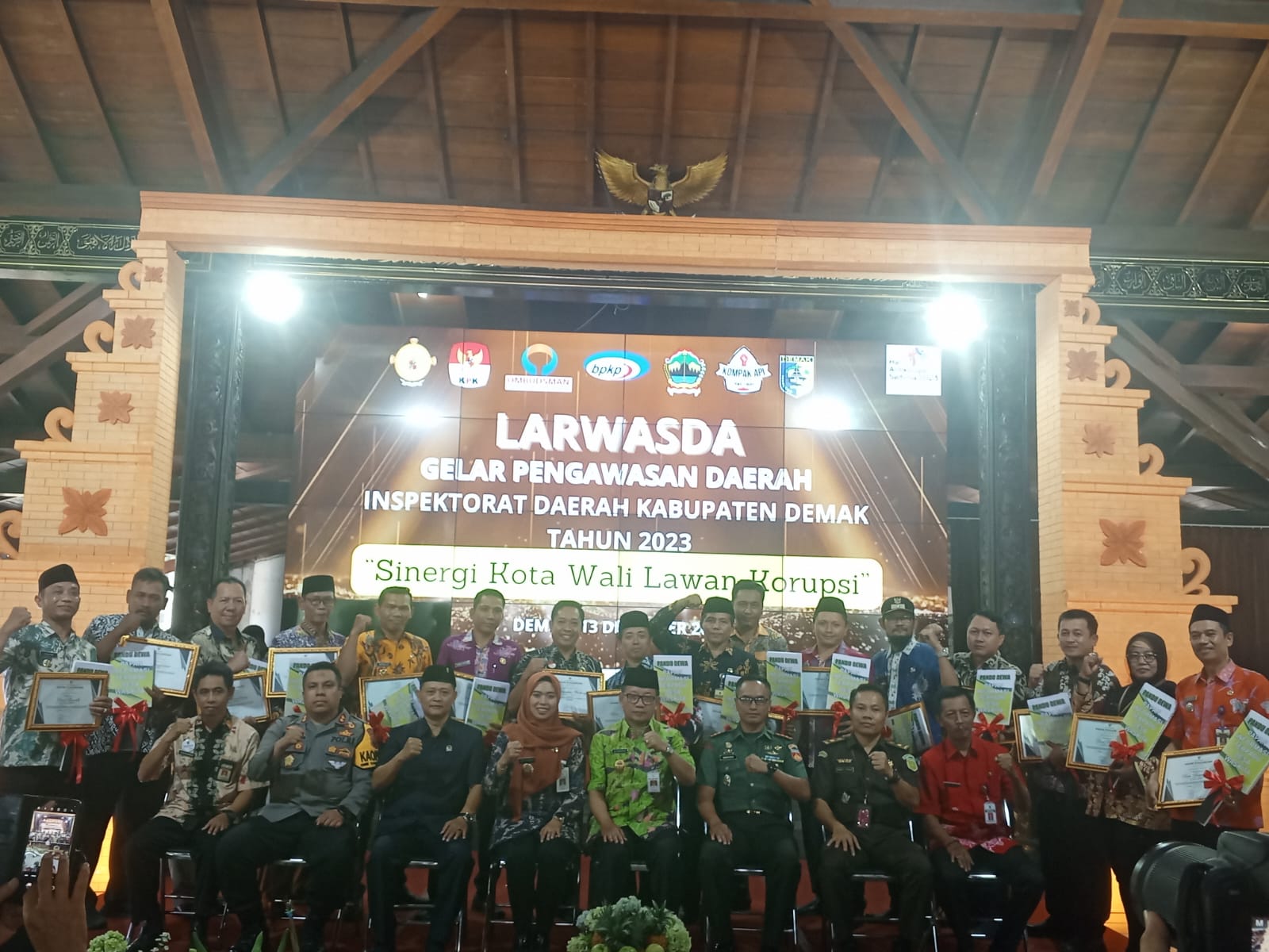 Demak – Bupati Eisti’anah dan anggota Forkopimda Demak menghadiri kegiatan Gelar Pengawasan Daerah (Larwasda) yang di selenggarakan oleh Inspektorat Kabupaten Demak di Pendopo Satya Bhakti Praja, Rabu (13/12). Hadir secara zoom dari KPK RI Azril Zah yang menjadi keynote speaker, Muhammad Hilmi Rahman perwakilan BPK Jateng, Sudiatmoko perwakilan BPKP jateng, Kun Retno Handayani perwakilan Ombudsman RI Jateng, Endah Ratnawati dari Inspektorat provinsi Jateng.