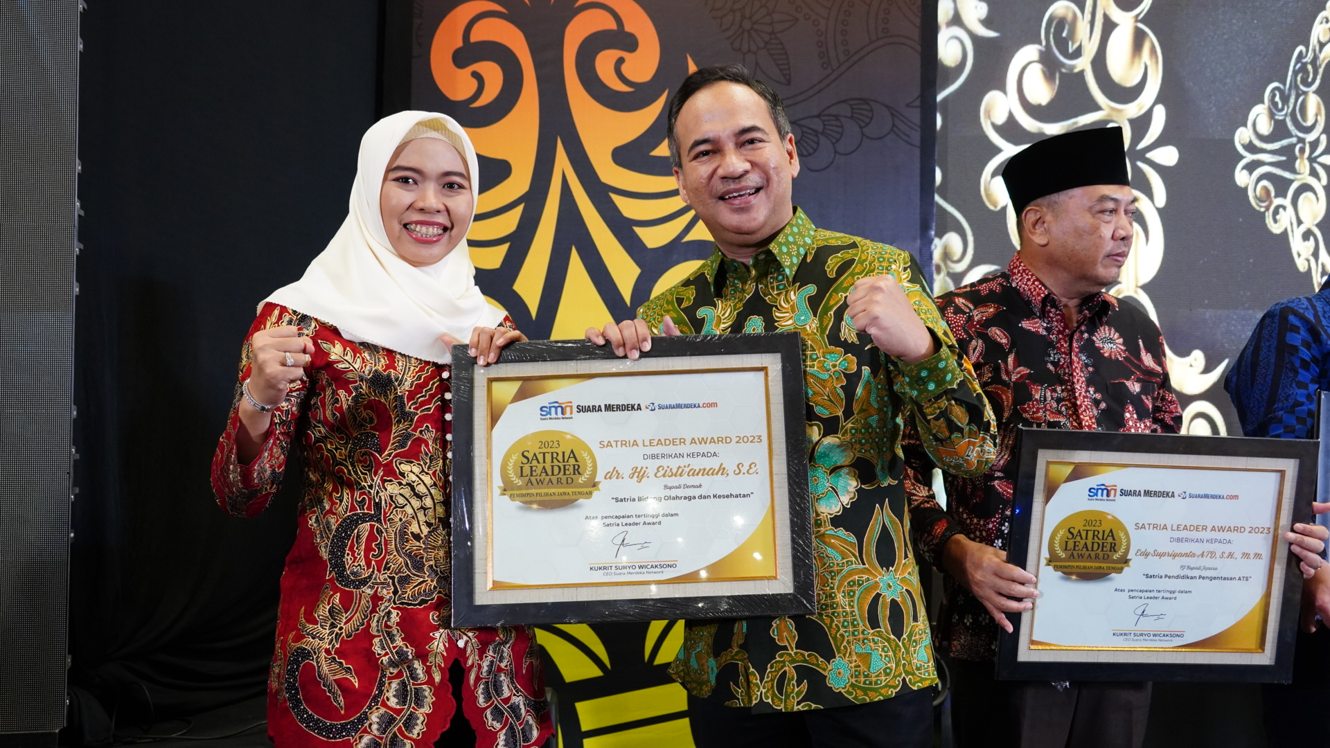 Semarang – Bupati Demak Eisti’anah menerima penghargaan Satria Leader Award 2023, Kategori Satria Bidang Olahraga dan Kesehatan dari Suara Merdeka Network (SMN) yang merupakan bagian dari ajang Satria Brand Award (SBA) tahun 2023.