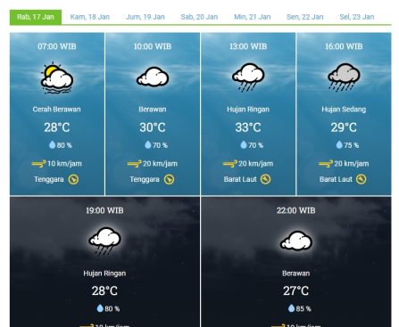 Demak – Setelah kemarin malam Kabupaten Demak di guyur hujan ringan dan petir menyambar. Badan Meteorologi, Klimatologi, dan Geofisika (BMKG) merilis prakiraan cuaca untuk wilayah Kabupaten Demak, Rabu, (17/01/24). Cuaca pagi hari pukul 07.00 WIB terpantau cerah berawan, dengan suhu udara 28°C, kelembaban udara 80 %, kecepatan angin 10 km/jam, arah angin dari Tenggara. Kemudian […]