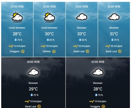 Demak – Setelah beberapa waktu lalu Kabupaten Demak di guyur hujan hingga malam hari. Badan Meteorologi, Klimatologi, dan Geofisika (BMKG) merilis prakiraan cuaca untuk wilayah Kabupaten Demak, Jum’at, (12/01/24). Cuaca pagi hari pukul 07.00 WIB terpantau cerah berawan, dengan suhu udara 28°C, kelembaban udara 75 %, kecepatan angin 10 km/jam, arah angin dari Tenggara. Kemudian […]