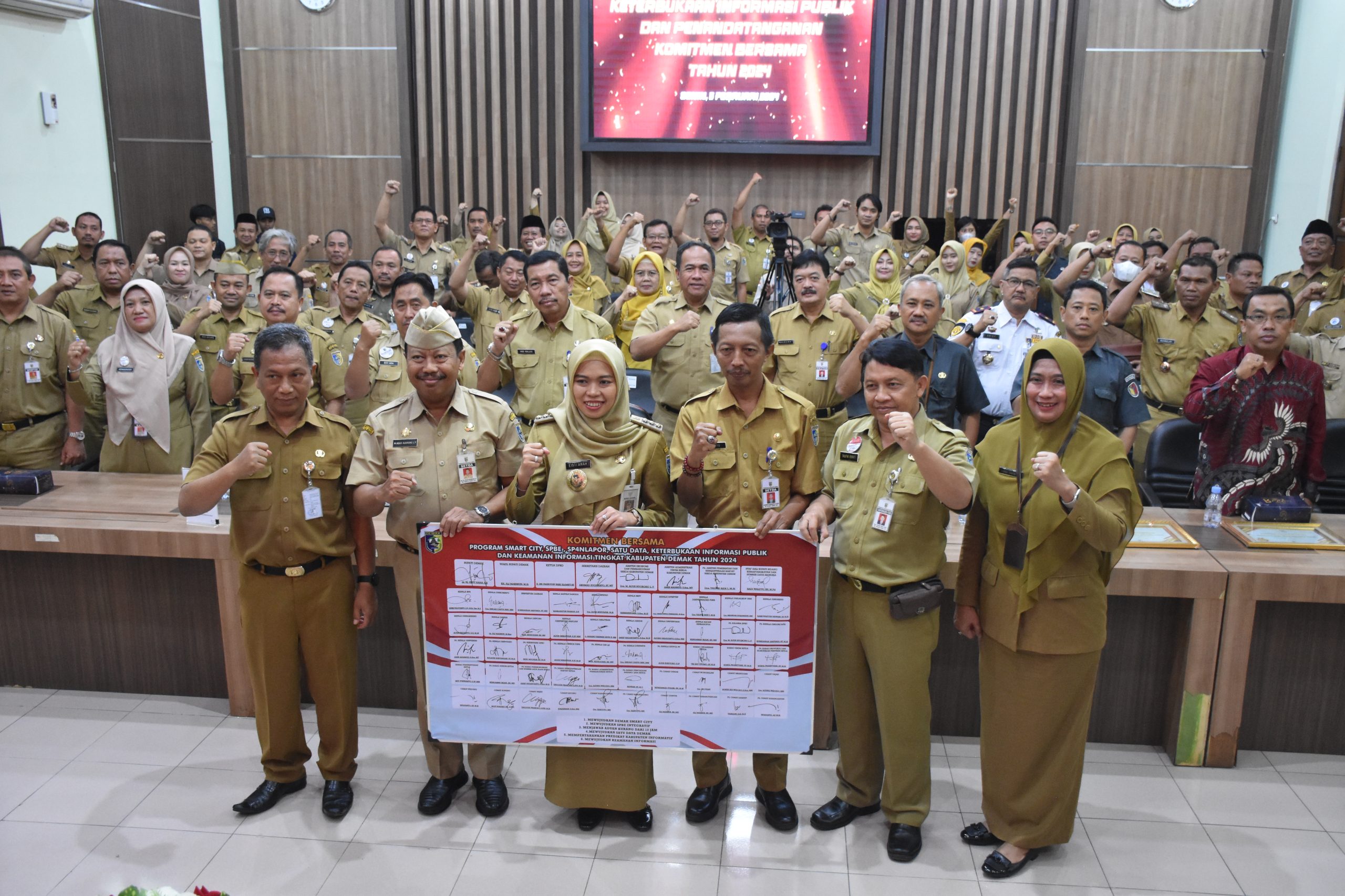Demak – Para pimpinan perangkat daerah beserta para Camat dan kepala Bagian Menandatangani Komitmen Bersama tahun 2024 dihadapan bupati Eisti’anah dan Sekda Akhmad Sugiharto. Berlangsung di gedung Grhadika Bina Praja, Senin (5/2/24). Penandatanganan tersebut merupakan bentuk keseriusan para pimpinan perangkat Daerah terhadap program dan pelaksanaan Smart City, SP4N Lapor, Satu Data dan Keterbukaan Informasi Publik di Kabupaten Demak.