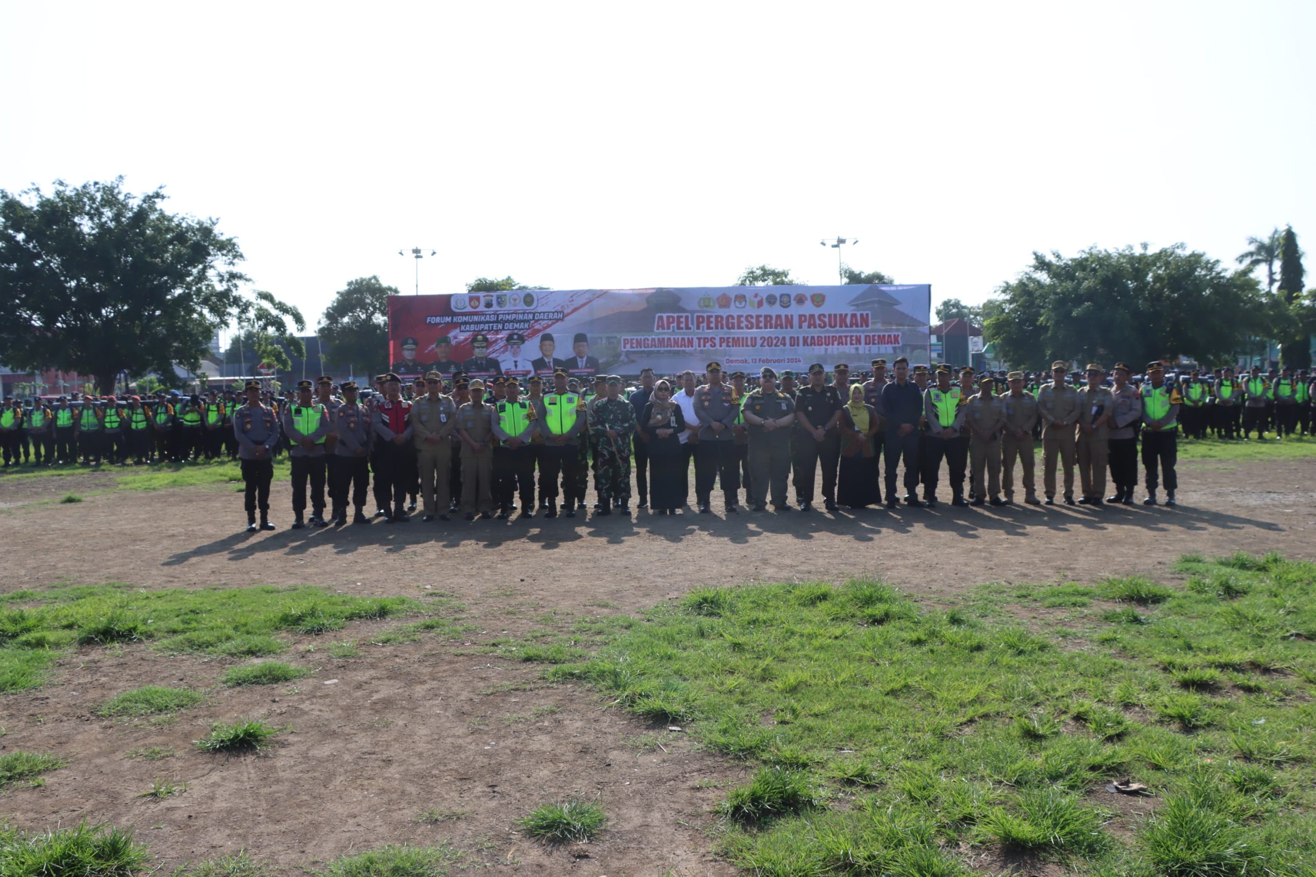 Demak – Bupati Demak Eisti’anah memimpin Apel Pergeseran Pasukan Pengamanan TPS Pemilu 2024, yang di gelar di alun alun Demak, Selasa (13/2/24).