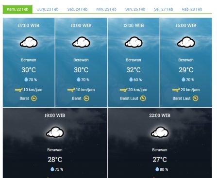 Demak – Badan Meteorologi, Klimatologi, dan Geofisika (BMKG) memperkirakan cuaca untuk Kabupaten Demak pada hari Kamis, 22 Februari 2024. Menurut laporan terbaru, kondisi cuaca di wilayah Demak diperkirakan akan berawan sepanjang hari. Pagi hari, warga Demak akan disambut dengan cuaca berawan dan suhu udara berkisar antara 29°C hingga 30°C. Tingkat kelembaban udara diperkirakan akan berada […]