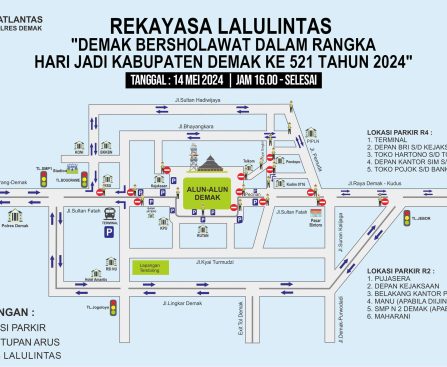 Demak – Sehubungan akan dilaksanakan Demak Bersholawat yang akan di gelar di alun alun Demak, Selasa 14 Mei 2024 malam , pihak satlantas polres Demak melakukan penutupan dan pengalihan jalan menuju pusat kota. Kendaraan dari arah Semarang menuju Kudus di alihkan melalui TL Katonsari ( jalan lingkar) menuju TL Jebor, atau menuju TL Bogorame ke […]