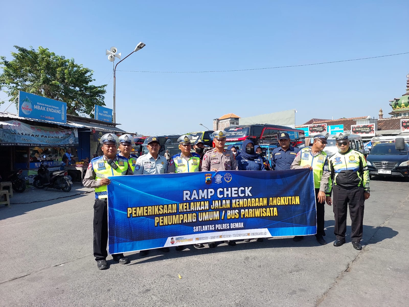 Demak – Untuk meminimalkan risiko kecelakaan, Satlantas Polres Demak bersama Dokkes Polres Demak, Jasa Raharja, dan Dinas Perhubungan, melakukan pemeriksaan kelaikan (ramp check) kendaraan pariwisata ( bus) yang sedang berhenti di area parkir Pariwisata Kadilangu.