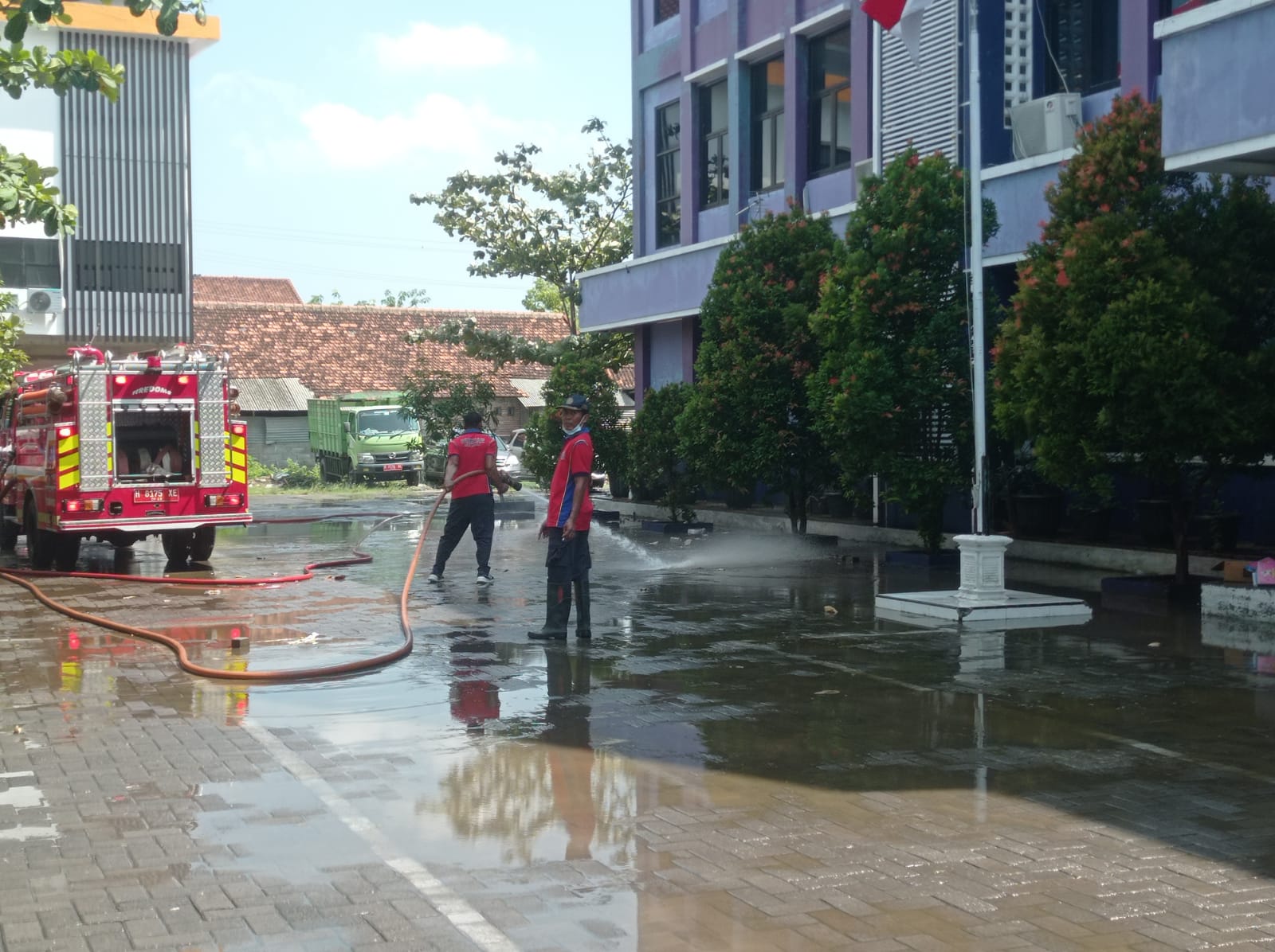 Dalam proses pembersihan petugas damkar melakukan penyemprotan menggunakan air bertekanan tinggi dengan mobil pemadam.
