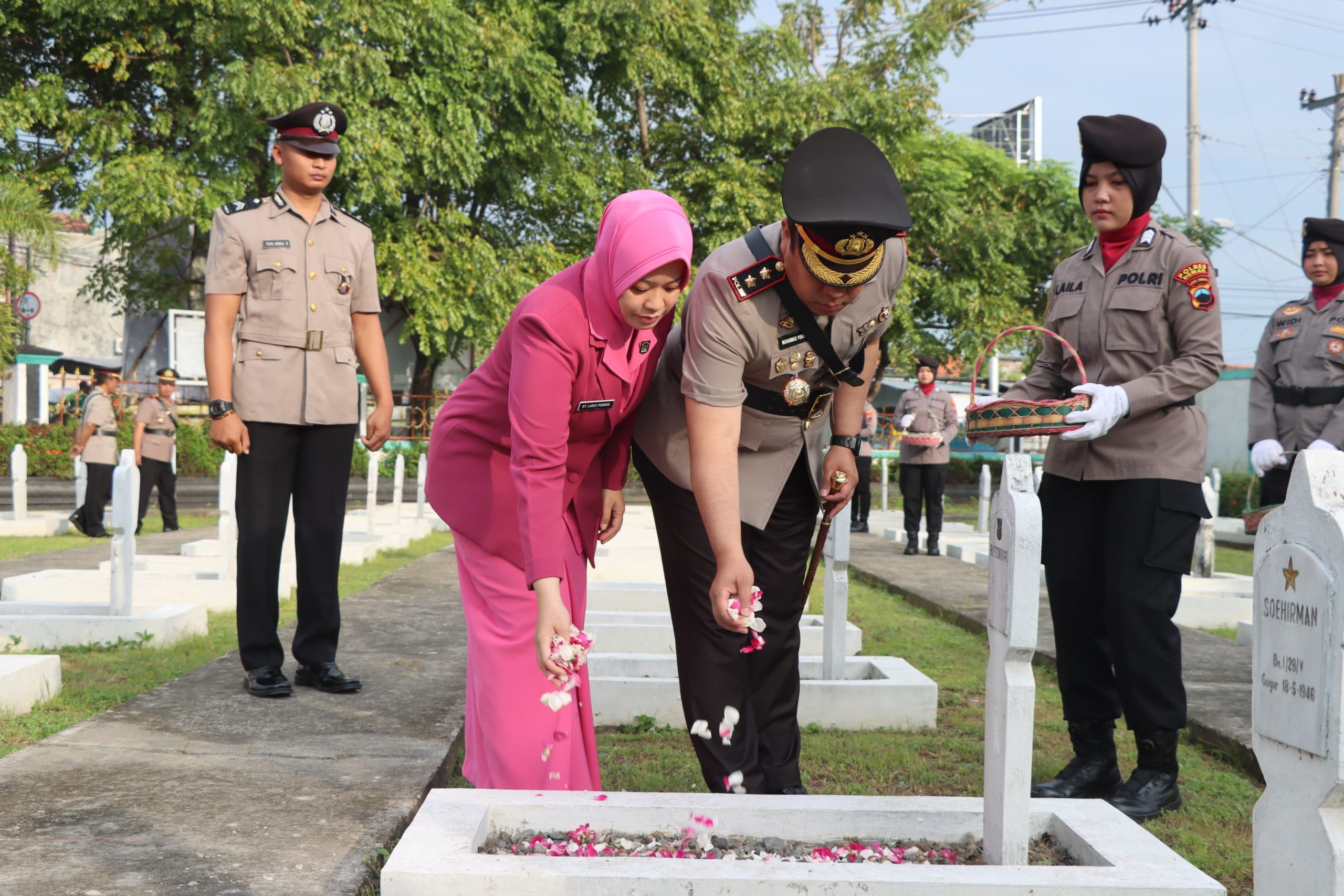 Demak – Jajaran Polres Demak melaksanakan ziarah ke Taman Makam Pahlawan (TMP) Cahya Ratna Bintarum dalam rangka memperingati Hari Bhayangkara ke-78. Prosesi ziarah dimulai dengan penghormatan kepada arwah para pahlawan, dilanjutkan dengan Kapolres meletakan karangan bunga secara simbolis didepan monumen makam pahlawan, diikuti peserta ziarah melakukan tabur bunga dan berdo’a diatas pusara pahlawan.
