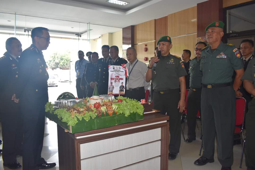 Kedatangan puluhan anggota TNI dengan membawa nasi tumpeng dan kue ulang tahun ini disambut Waka Polres Kompol Kompol Aldino Agus Anggoro beserta seluruh PJU dan Perwira Polres Demak di lobi Mapolres Demak.