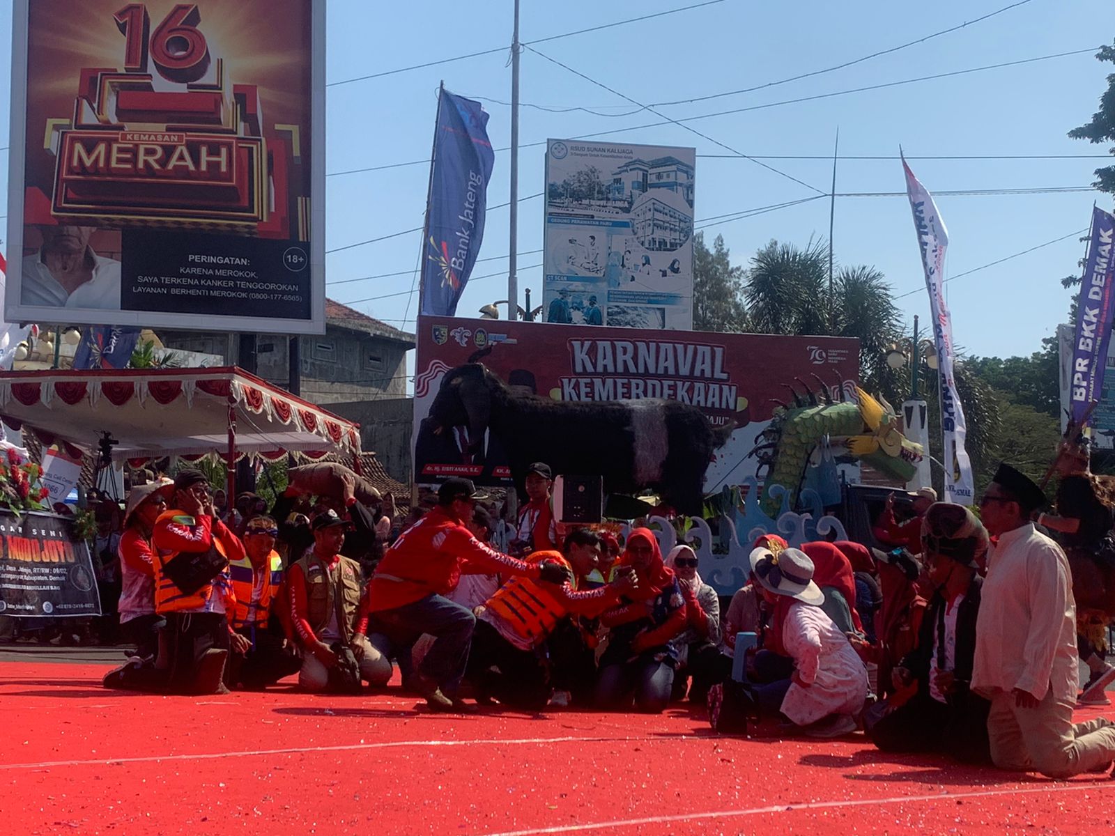 Demak – Teatrikal Banjir Karanganyar menjadi penutup pertunjukan yang apik pada Karnaval Kemerdekaan HUT ke-79 RI Tingkat Kabupaten Demak.