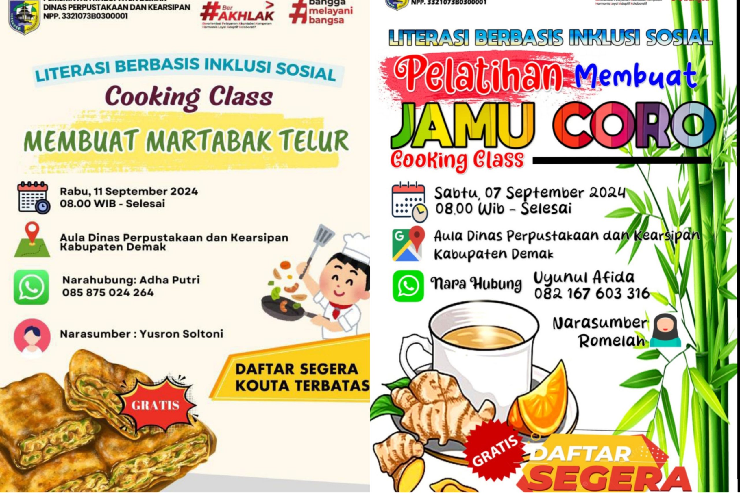 Peserta yang berminat dapat segera mendaftar karena kuota peserta terbatas. Pendaftaran bisa dilakukan melalui kontak yang telah disediakan, yaitu Uyunul Afida di nomor 082 167 603 316 untuk jamu coro sedangkan untuk pelatihan membuat martabak telor yaitu Adha Putri di nomor 085 875 024 264. (Kominfo/Apj).