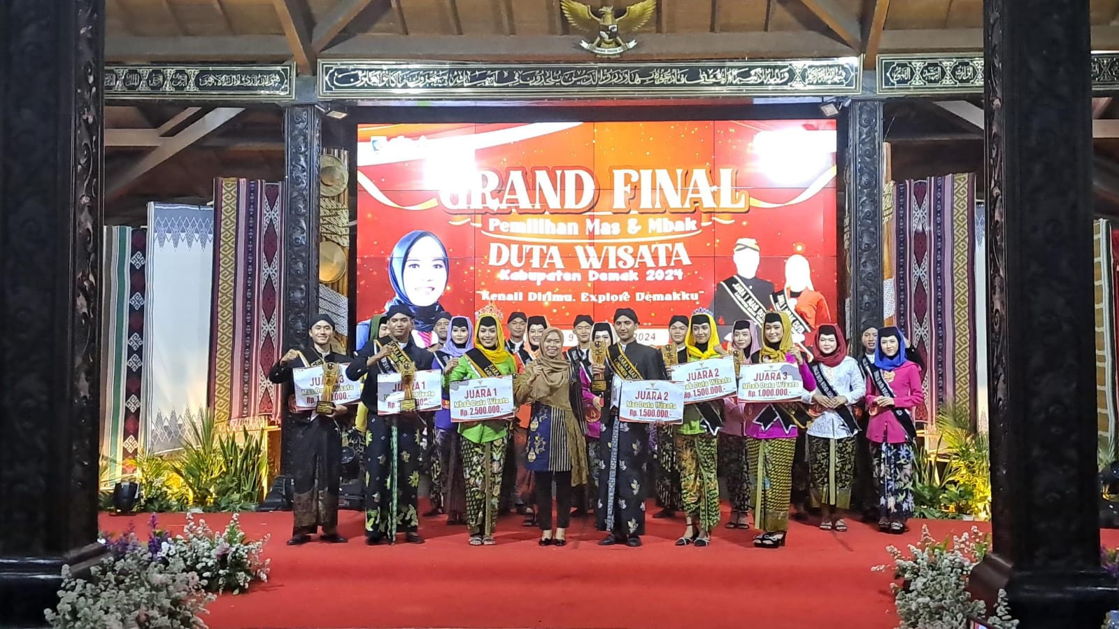 Demak – Sebanyak 20 finalis adu potensi pada malam Grand Final Pemilihan Mas dan Mbak Duta Wisata Kabupaten Demak di Pendopo Satya Bhakti Praja, Senin (09/09/24) malam. Fajar Ilham Maulana dan Chintya Cahya Ningrum dinobatkan sebagai Mas dan Mbak Duta Wisata Kabupaten Demak 2024 yang besaing dengan 20 finalis. Menyusul juara 2, Umar khan dan Dian Arsiana Putri. Sementara juara 3, Faisal dan Thalita Intan ferina Diana Sari.