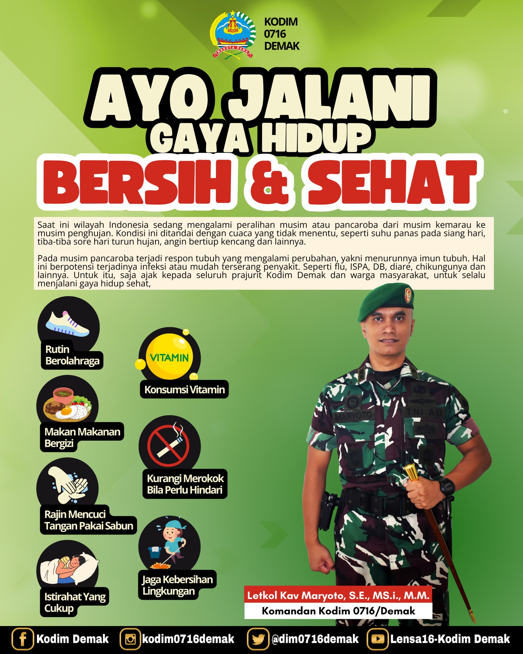 Demak – Komandan Distrik Militer (Kodim) 0716/Demak Letkol Kav Maryoto mengajak masyarakat serta prajurit TNI untuk menjalani gaya hidup bersih dan sehat, terutama di musim pancaroba.
