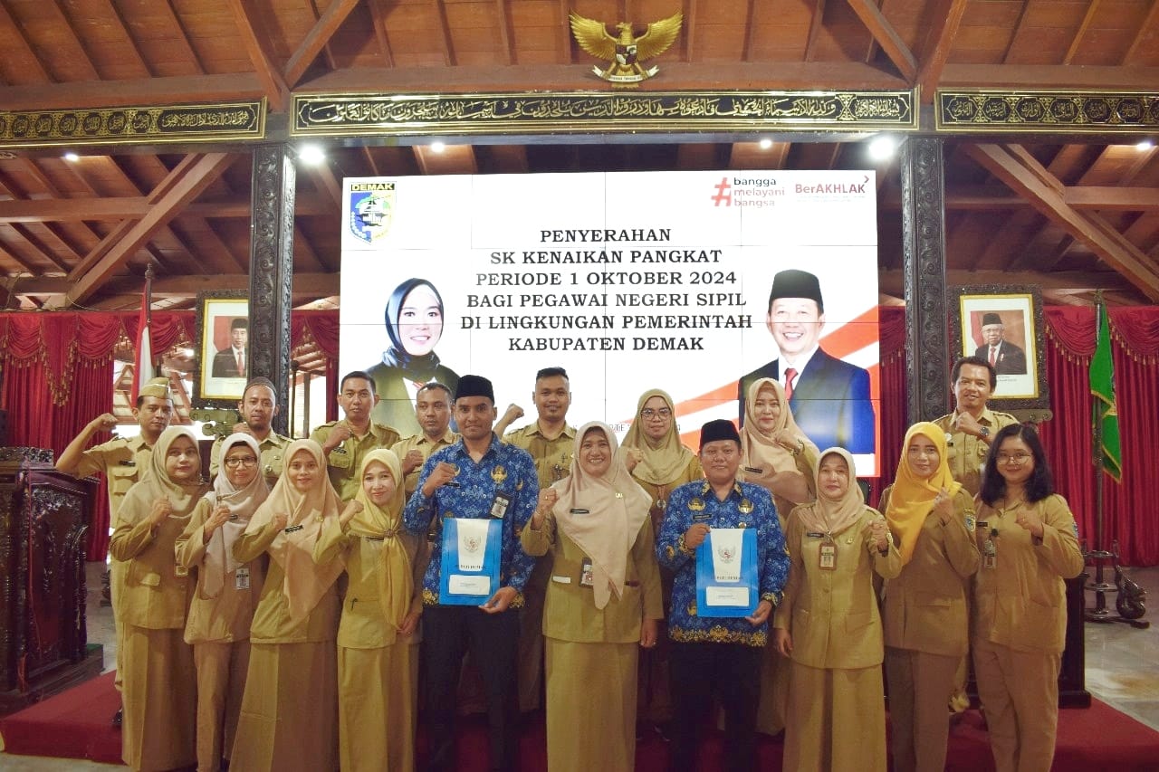 Demak- Sebanyak 237 ASN di lingkungan pemerintah kabupaten Demak menerima Surat Keputusan ( SK) kenaikan pangkat periode 1 Oktober 2024. Penyerahan di lakukan secara simbolis oleh Wakil Bupati Demak, KH Ali Makhsun di Pendopo Satya Bhakti Praja Senin, 23/09/2024.