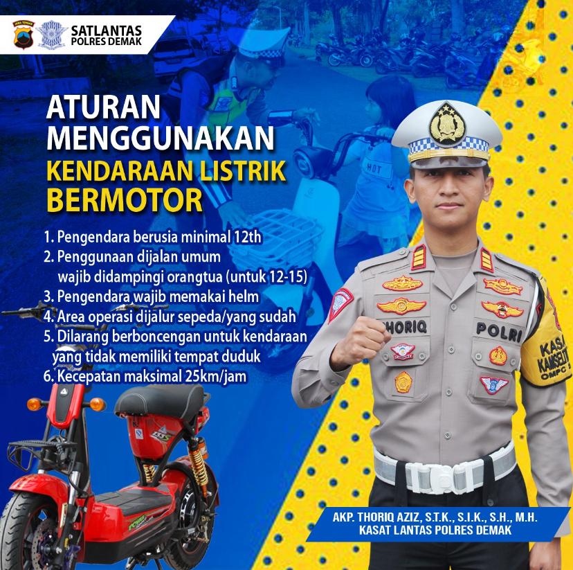 AKP Thoriq Aziz, Kepala Satuan Lalu Lintas Polres Demak, menegaskan bahwa pengguna sepeda listrik harus mematuhi sejumlah aturan yang berlaku, termasuk di antaranya, pengguna sepeda listrik wajib berusia minimal 12 tahun. Penggunaan di jalan umum wajib di dampingi orang tua untuk usia 12-15 tahun. Penggunaan helm menjadi kewajiban bagi setiap pengendara sepeda listrik.