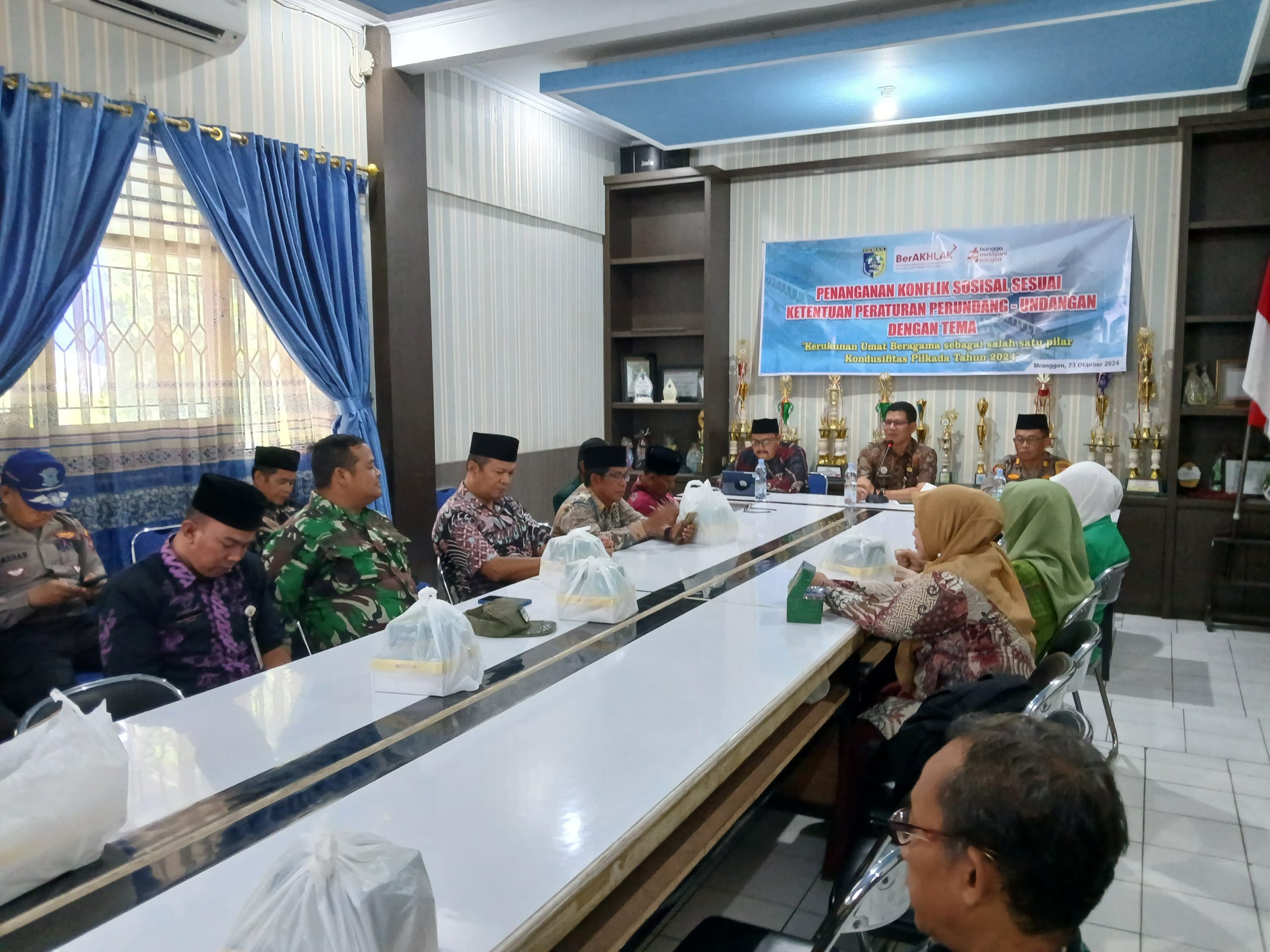 Demak – Untuk mencegah konflik sosial Dalam pelaksanaan Pilkada 2024, Pemerintah Kecamatan Mranggen menggandeng Majelis Ulama Indonesia (MUI) Kecamatan Mranggen menggelar pertemuan dengan bertema “Kerukunan Umat Beragama sebagai Salah Satu Pilar Kondusifitas Pilkada” di ruang rapat Kecamatan Mranggen. Rabu (23/10/2024).
