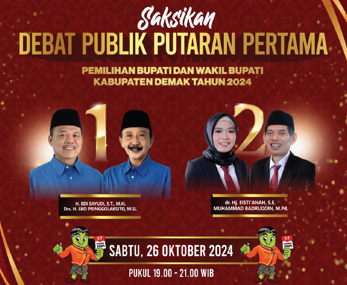 Menurut ketua KPU kabupaten Demak, Siti Ulfaati Debat Publik akan di gelar di Studio TVRI Jawa Tengah di Pucang Gading Mranggen. Pada hari Sabtu, 26 Oktober 2024 pukul 19.00 WIB – 21.00 WIB. Dengan menghadirkan peserta debat dua pasangan Calon, yakni pasangan nomor urut 1. Edi Sayudi dan Eko Pringgolaksito serta pasangan nomor urut 2. Eisti’anah dan M Badruddin.
