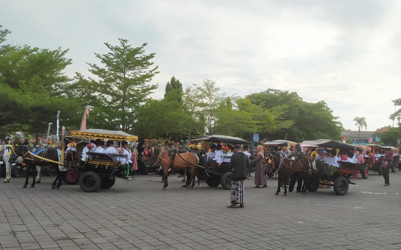 Demak- Keceriaan ditunjukan anak anak peserta khitan Tabaarukan yang turut dalam barisan pawai panjang jimat dengan menaiki andong hias. Yang di gelar Takmir Masjid Agung Demak dalam rangka acara peringatan Haul Agung Kanjeng Sultan Fatah Al Albar Sayidin Panotogomo ke 522. Yang berlangsung di depan Masjid Agung Demak, Sabtu,(7/12/24).