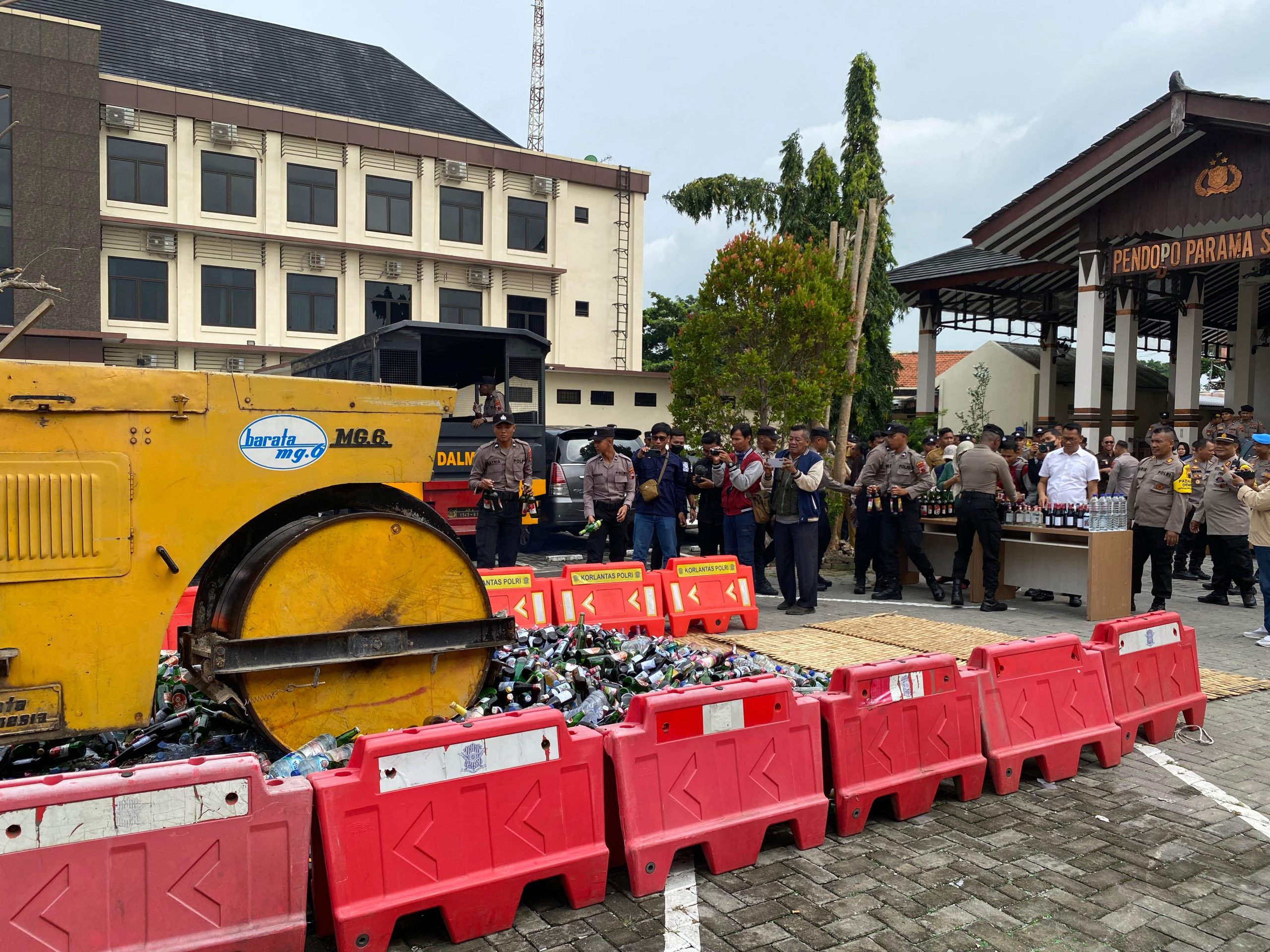Demak – Sebanyak 3.612 botol minuman keras (miras) berbagai jenis dan merek, hasil dari Kegiatan Rutin Yang Ditingkatkan (KRYD) polres Demak di musnahkan dengan cara di gilas kendaraan slender atau tendem roller. Dalam rangka menciptakan kondisi aman perayaan Natal 2024 dan Tahun Baru 2025. Berlangsung di halaman Mapolres Demak pada Senin (30/12/24).