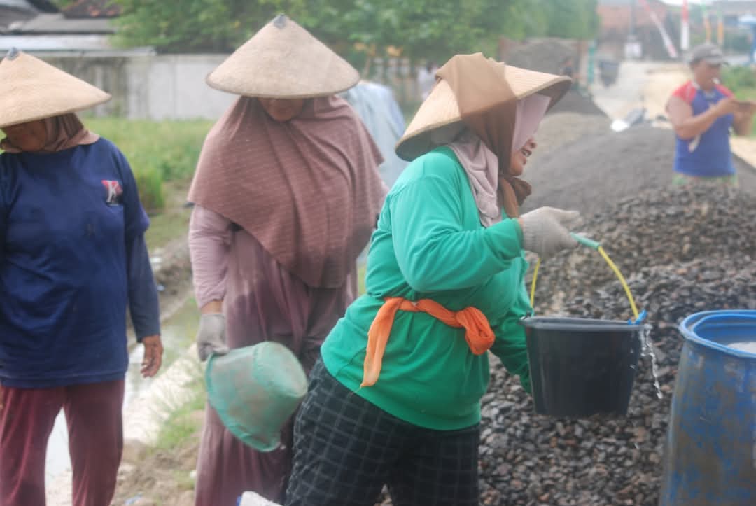 Warga dari kalangan pria dan wanita turut ambil bagian membantu pekerjaan rela berpanas-panasan di lokasi sasaran fisik pengecoran jalan demi kemajuan desanya.