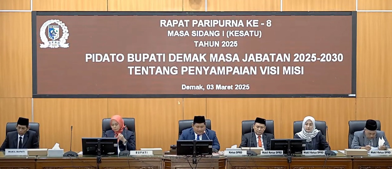 Demak – Dewan Perwakilan Rakyat Daerah (DPRD) Kabupaten Demak menggelar Rapat Paripurna DPRD Kabupaten Demak ke-8 Masa Sidang 1 Tahun 2025 dengan agenda Pidato Bupati Demak Masa Jabatan 2025-2023 tentang penyampaian Visi Misi, Senin (03/03/25) bertempat di Ruang Rapat DPRD.