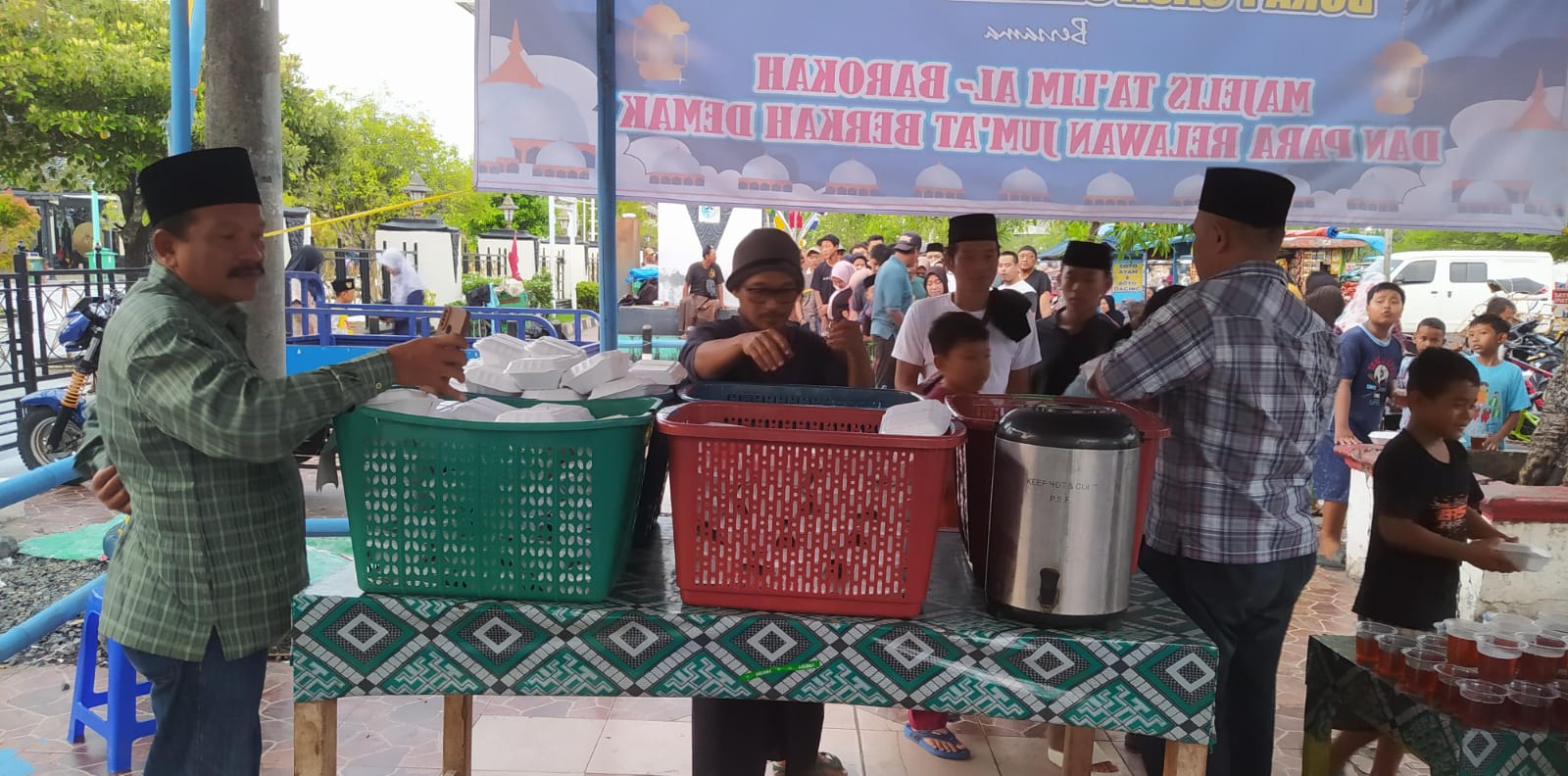 Demak – Tebar berkah melalui pembagian takjil menjelang buka puasa merupakan agenda rutin Majelis Ta’lim Al Barokah. Bersama dengan para relawan Jum’at Berkah setiap sore menjelang buka puasa membagikan ratusan nasi yang di kemas dalam Styrofoam. Serta minuman teh hangat dalam gelas plastik.