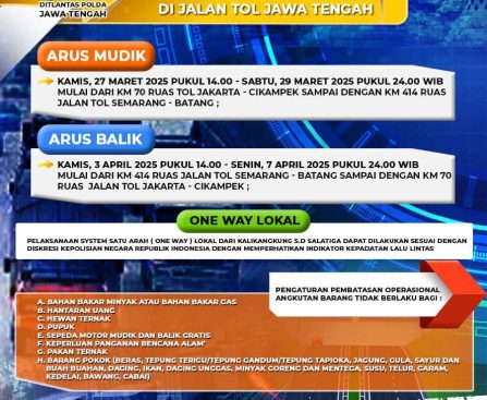 Semarang – Menghadapi arus mudik dan balik Lebaran 2025, Direktorat Lalu Lintas (Ditlantas) Polda Jawa Tengah akan menerapkan sistem one way dan ganjil genap di ruas jalan tol wilayah Jawa Tengah. Penerapan rekayasa lalu lintas saat Mudik ini akan berlangsung pada 27 Maret 2025 pukul 14.00 hingga 29 Maret 2025 pukul 24.00 WIB, dimulai dari […]