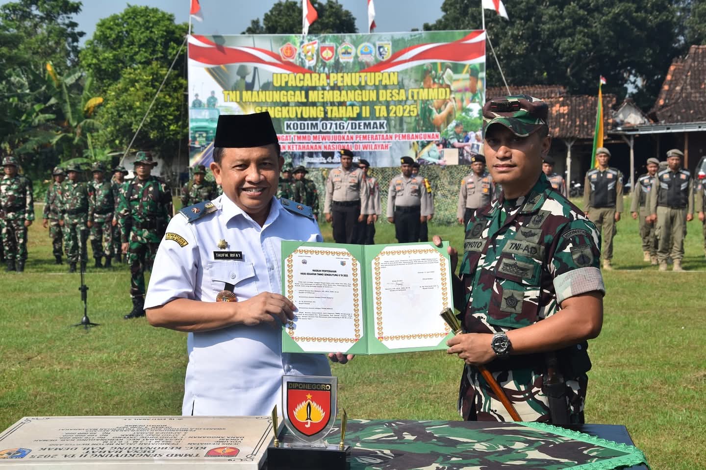 DEMAK – Pelaksanaan Tentara Manunggal Membangun Desa (TMMD) Sengkuyung Tahap II Tahun 2025 di Desa Babat, Kecamatan Kebonagung resmi ditutup. Upacara penutupan dipimpin langsung Komandan Kodim 0716/Demak Letkol Kav Maryoto, Rabu (04/06/2025).