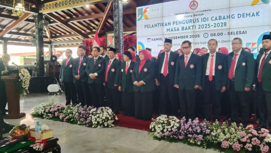 Demak – Ikatan Dokter Indonesia (IDI) Cabang Demak periode masa bakti 2025–2028 resmi dilantik, Kamis (18/12/25). Pelantikan pengurus dilakukan langsung oleh Ketua IDI Jawa Tengah, dr Elang Sumambar, bertempat di Pendopo Satya Bakti Praja Kabupaten Demak.