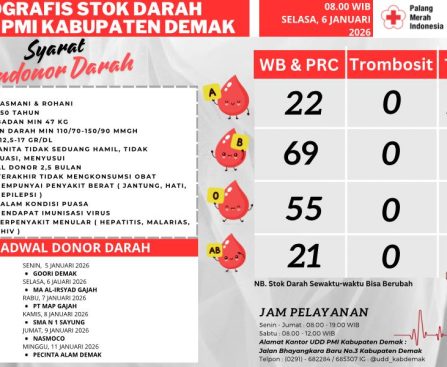 Demak – Palang Merah Indonesia (PMI) Kabupaten Demak merilis informasi terkini mengenai ketersediaan stok darah serta jadwal kegiatan donor darah. Berdasarkan laporan terbaru, stok darah di Unit Donor Darah (UDD) PMI Kabupaten Demak per hari Selasa (06/01/26) pukul 08.00 WIB adalah Golongan darah A tersedia 22 kantong, Golongan darah B tersedia 69 kantong, Golongan darah […]