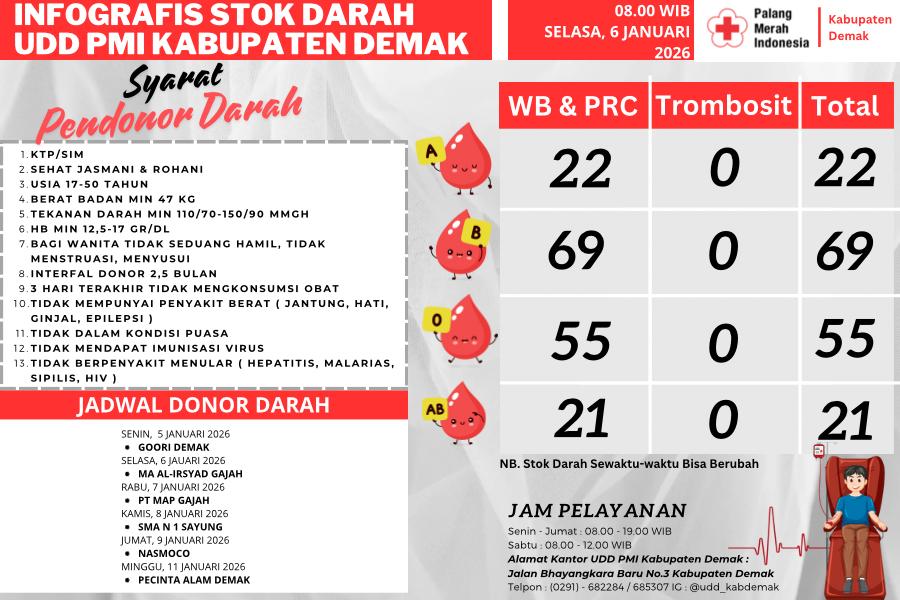 Demak – Palang Merah Indonesia (PMI) Kabupaten Demak merilis informasi terkini mengenai ketersediaan stok darah serta jadwal kegiatan donor darah. Berdasarkan laporan terbaru, stok darah di Unit Donor Darah (UDD) PMI Kabupaten Demak per hari Selasa (06/01/26) pukul 08.00 WIB adalah Golongan darah A tersedia 22 kantong, Golongan darah B tersedia 69 kantong, Golongan darah O tersedia 55 kantong dan Golongan darah AB tersedia 21 kantong.