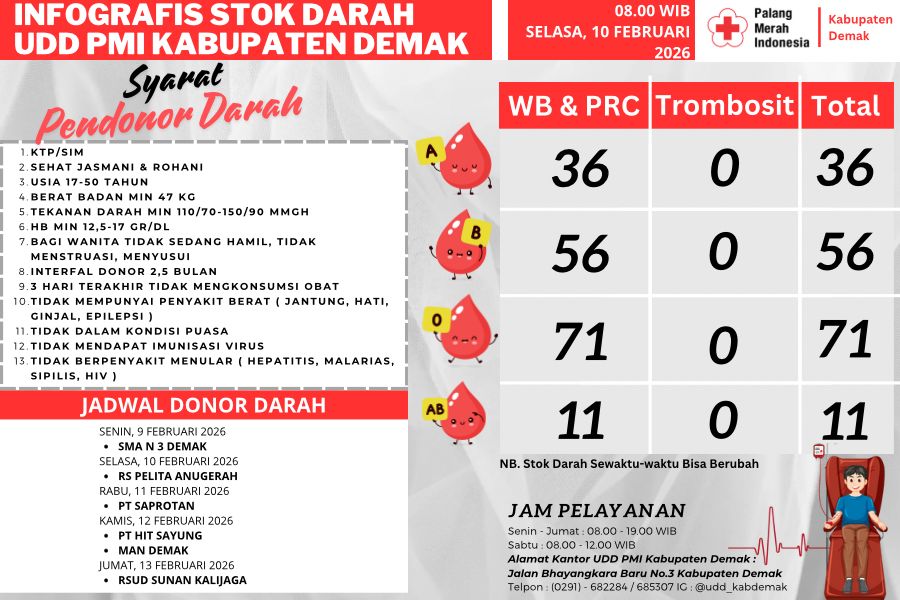 Demak – Unit Donor Darah (UDD) Palang Merah Indonesia Kabupaten Demak merilis data terbaru stok darah per Selasa, 10 Februari 2026 pukul 08.00 WIB. Berdasarkan infografis yang dirilis, ketersediaan darah saat ini masih mencukupi, dengan stok terbanyak berasal dari golongan darah O.