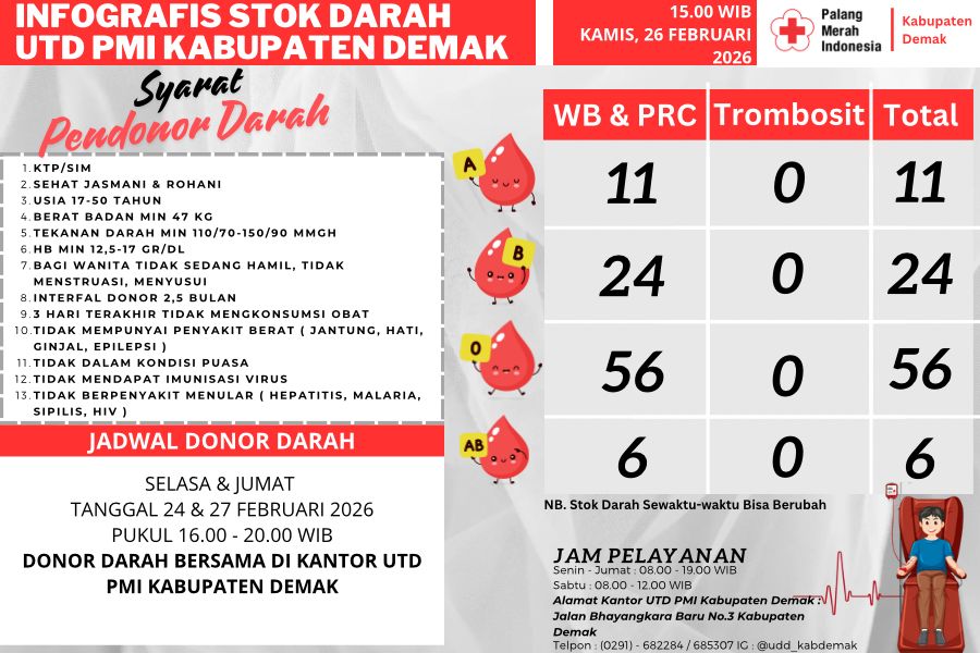 Sebagai upaya menjaga pasokan darah tetap stabil, PMI menggelar kegiatan donor darah bersama yang berlangsung pada 24 hingga 27 Februari 2026 mulai pukul 16.00 sampai 20.00 WIB. Kegiatan dipusatkan di Kantor Unit Transfusi Darah (UTD) PMI Kabupaten Demak.