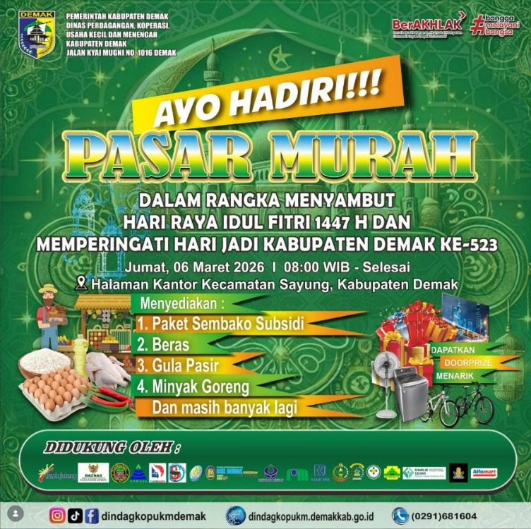 Demak – Pemkab Demak akan menggelar pasar murah dalam rangka menyambut Hari Raya Idulfitri 1447 Hijriah dan memperingati Hari Jadi Kabupaten Demak ke-523. Pasar yang menyediakan kebutuhan pokok dan kebutuhan lebaran tersebut diharapkan dapat membantu masyarakat dengan harga terjangkau menjelang hari besar keagamaan.