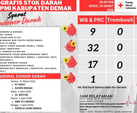 Demak – Ketersediaan stok darah di Unit Transfusi Darah (UTD) PMI Kabupaten Demak terpantau masih terbatas. Berdasarkan data terbaru per Senin, 30 Maret 2026 pukul 08.00 WIB, jumlah stok darah untuk semua golongan masih berada pada angka rendah. Rinciannya, golongan darah A tersedia sebanyak 9 kantong, golongan B sebanyak 32 kantong, golongan O sebanyak 17 […]