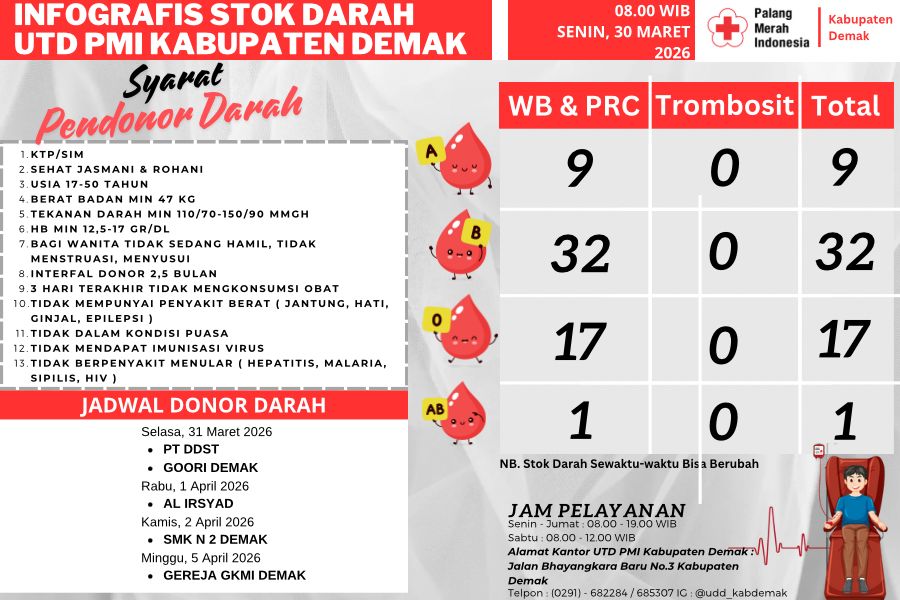 Demak – Ketersediaan stok darah di Unit Transfusi Darah (UTD) PMI Kabupaten Demak terpantau masih terbatas. Berdasarkan data terbaru per Senin, 30 Maret 2026 pukul 08.00 WIB, jumlah stok darah untuk semua golongan masih berada pada angka rendah.